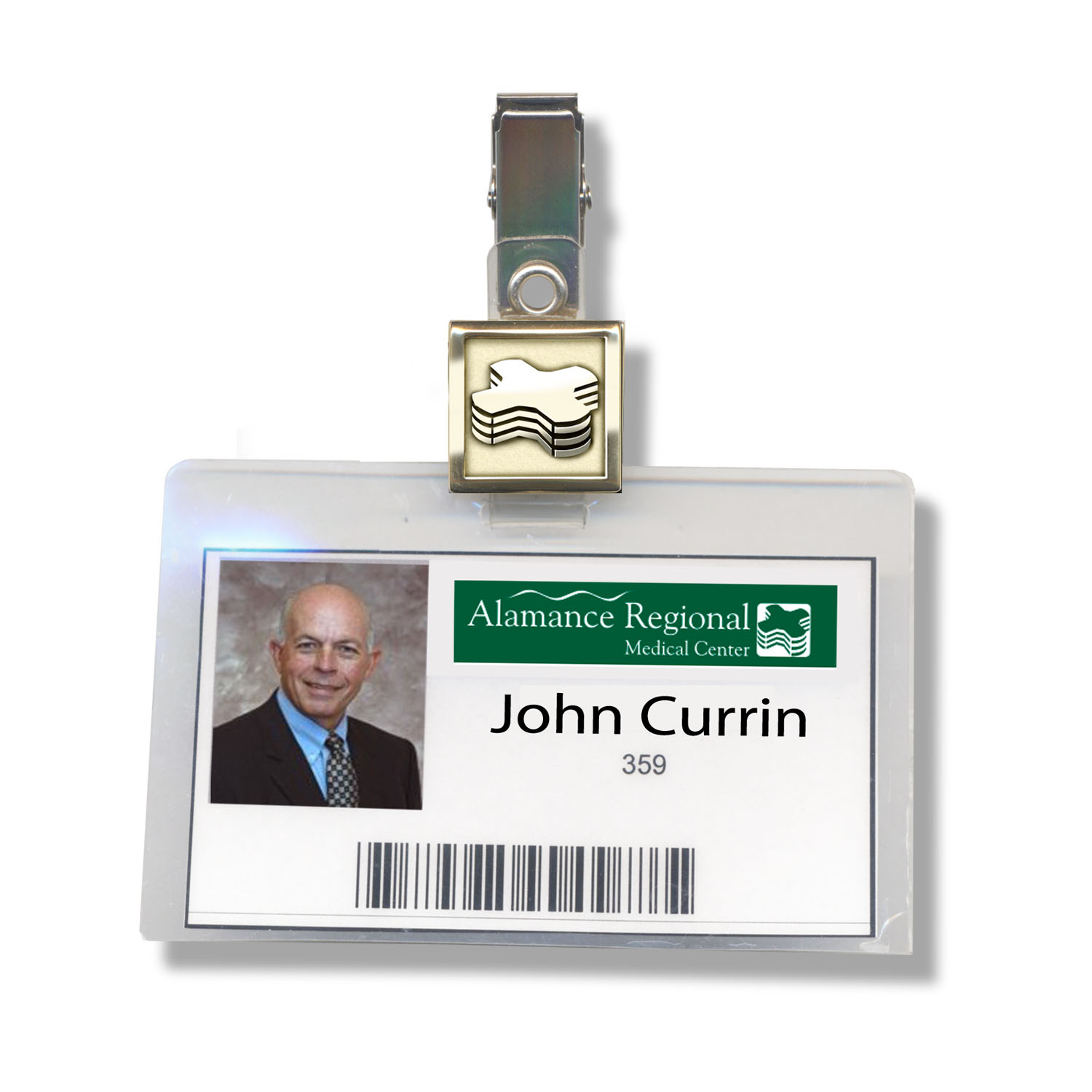 The Alamance Regional Medical Center logo is the focus of this gold sandblast and polished badge holder emblem. Numerals can be added to the emblem to indicate years of service.