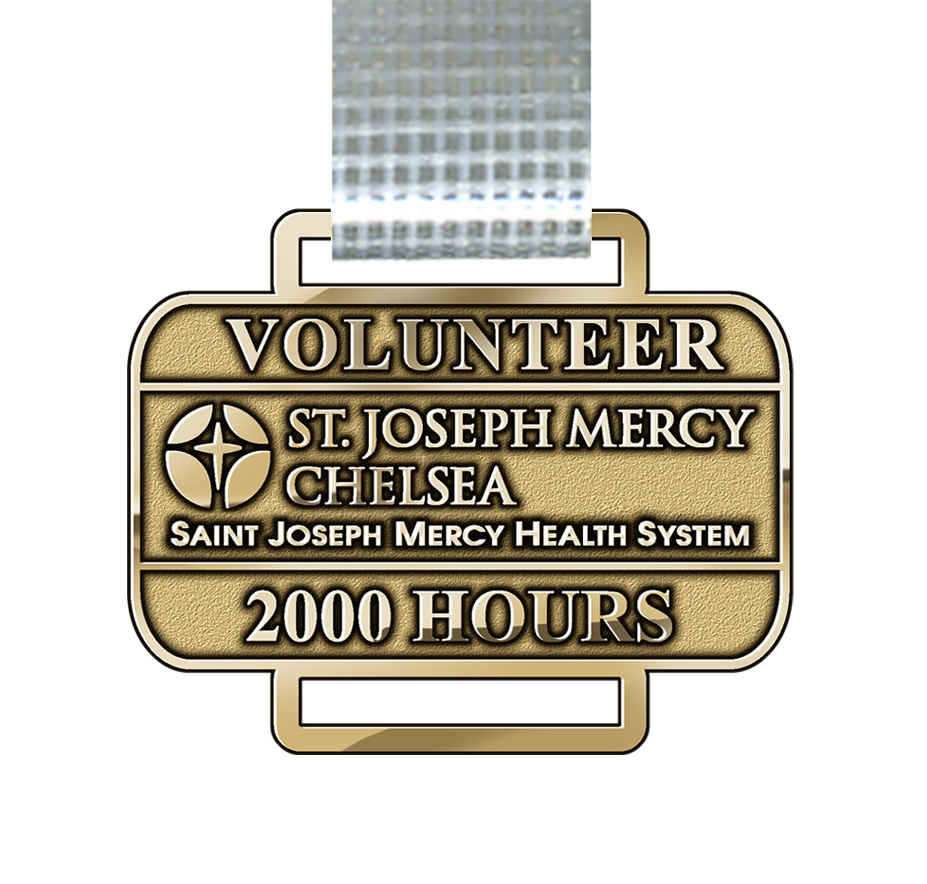 An antique finish offsets the raised and polished gold text and logo on this elegant custom hospital volunteer badge holder emblem that includes recognition of the thousands of hours served.