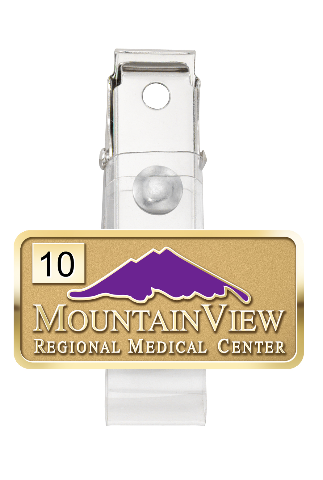 Purple color-filled mountains complement this custom gold sandblast and polished custom badge holder emblem with engraved years of service numeral.