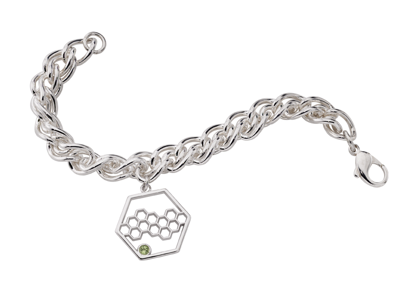 This sterling silver link chain bracelet features a modern and stylish honeycomb logo charm with a light green peridot stone.