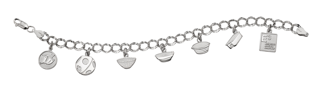 Multiple miniature custom sterling silver Tupperware product charms line this double link chain bracelet with lobster claw clasp. These charms are part of their consultants recognition program.