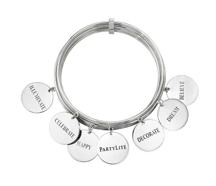 Inspirational custom silver charms attach to this multipiece bangle bracelet. These charms are part of their consultants recognition program.