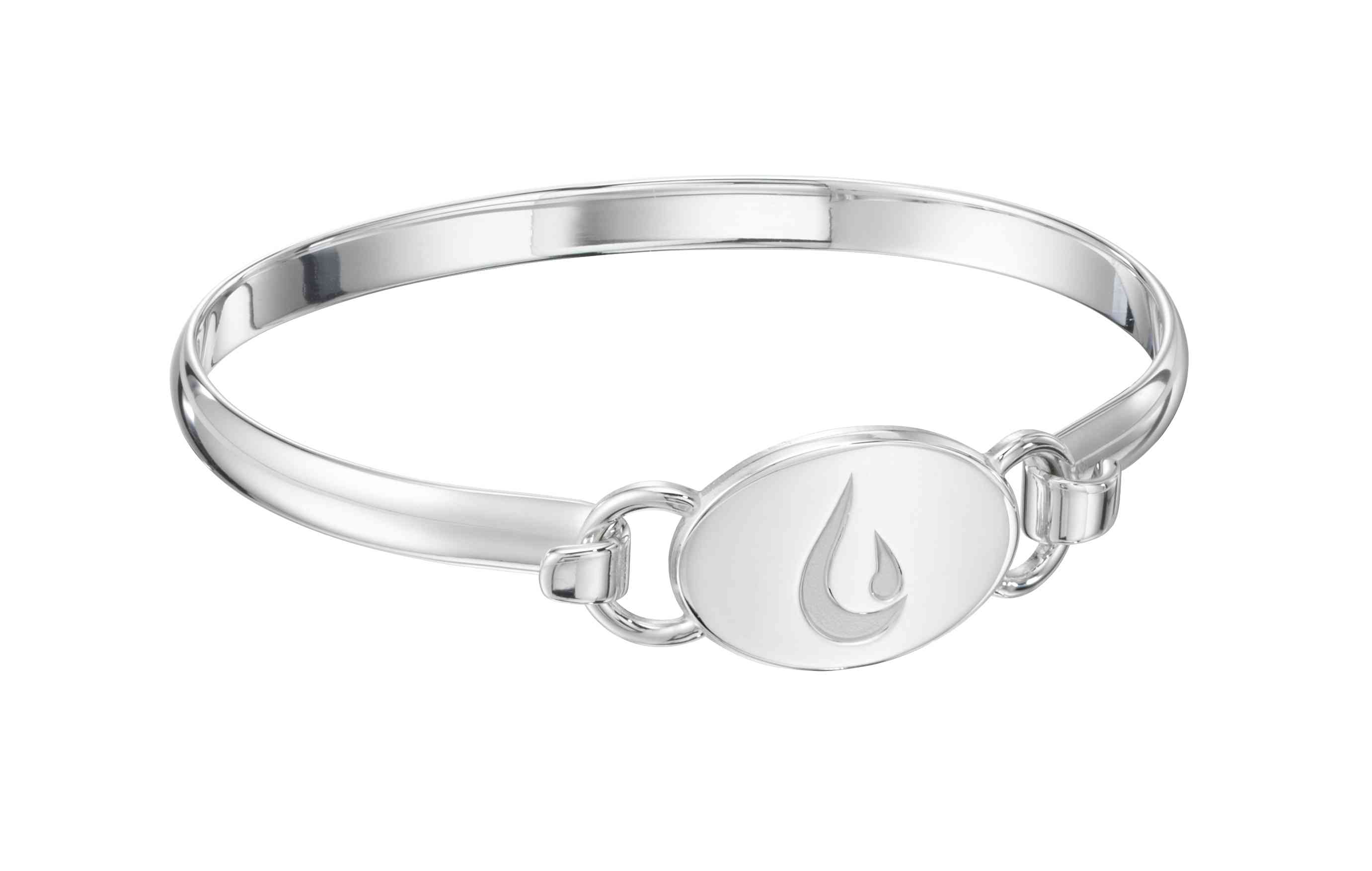 A flaming logo adorns this sterling silver interchangeable clasp bangle bracelet. The logoed clasp can be removed and replaced with other custom clasps for unlimited styles and designs.