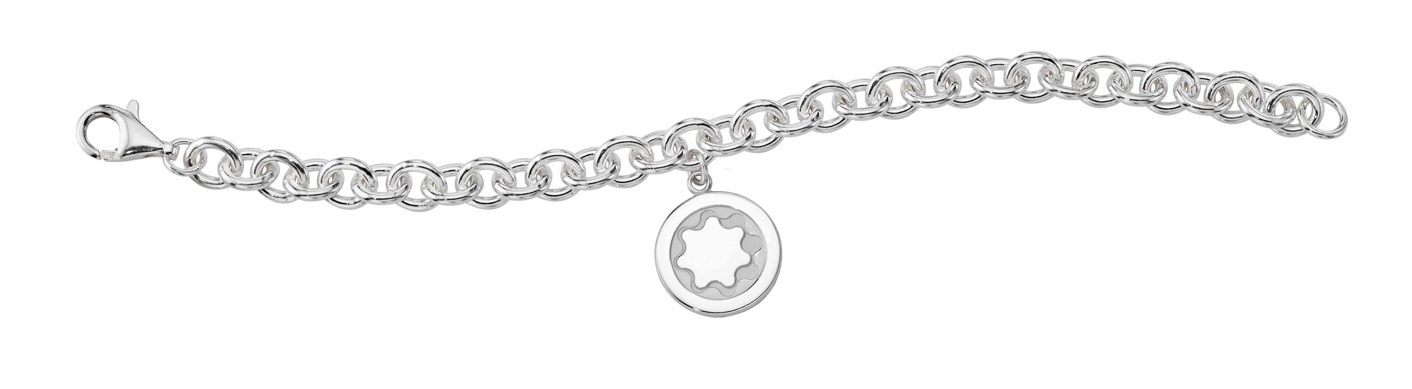 A mechanical gear logo is the centerpiece of this custom silver sandblast and polished charm attached to a sterling silver link bracelet with lobster claw clasp.