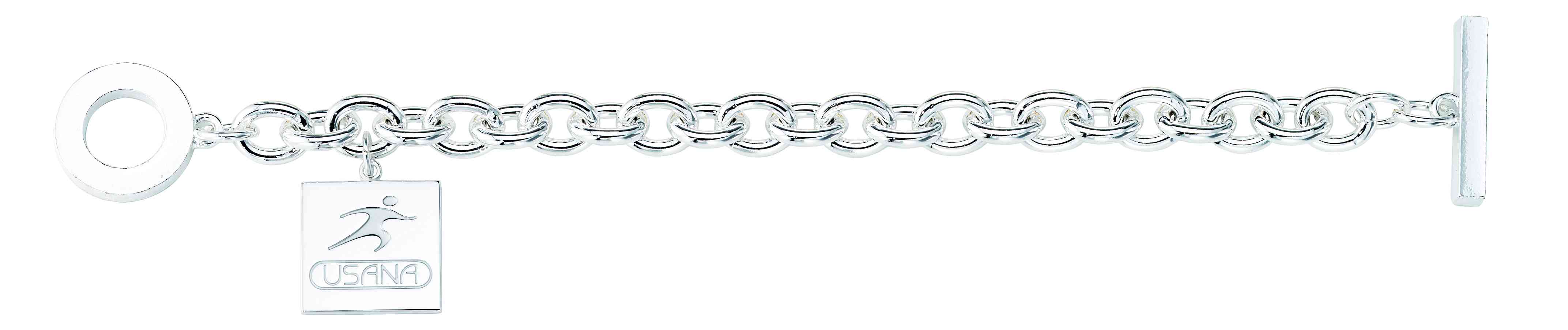 This high polished custom square silver charm features a recessed and sandblasted USANA logo attached to a silver link chain bracelet with toggle clasp.