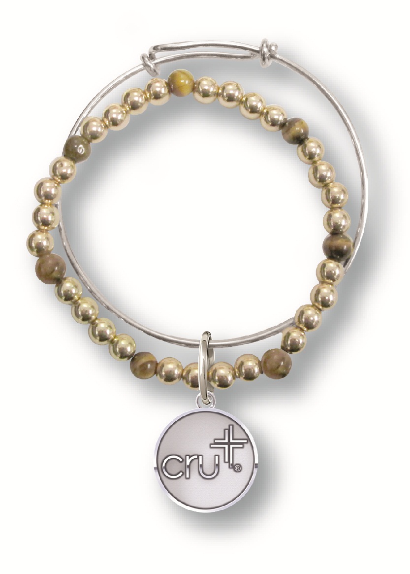This silver adjustable bangle and bead bracelet features a custom silver sandblast and polished charm with the CRU Christian Community logo at its center