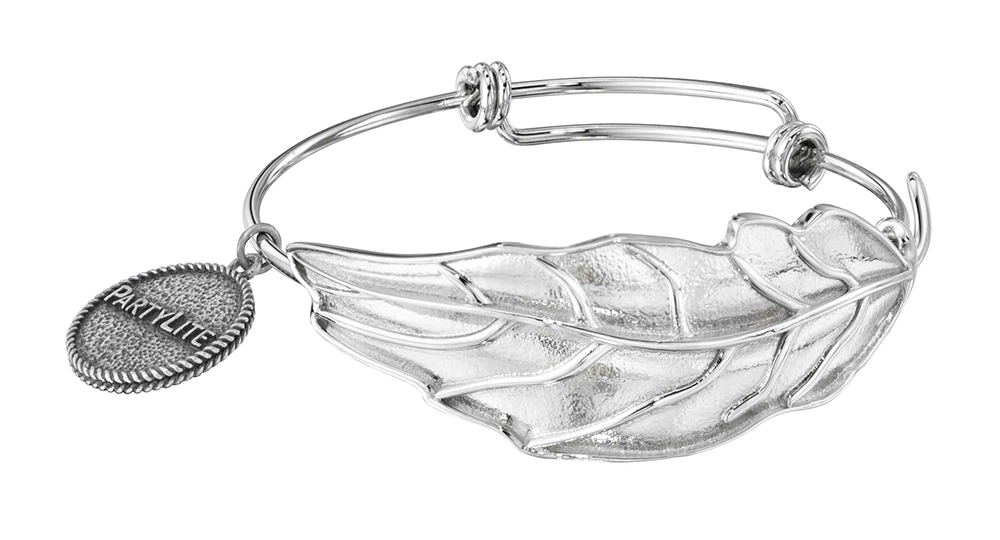 A beautiful modeled leaf wraps around this silver adjustable bangle bracelet with dangling antique finished silver PartyLite charm.