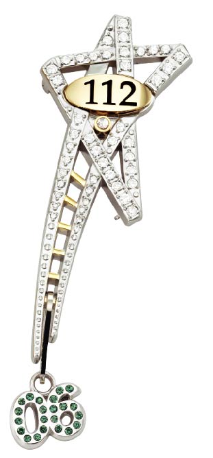 Diamonds are featured throughout this stunning custom two tone shooting star ladder add-on brooch pin. What makes this piece particulary unique is the ability to add on screw-in inserts like the numeral and gold collet diamond, as well as clip-on hanging elements like the "06" allowing for multiple on-the-spot recognition opportunities.