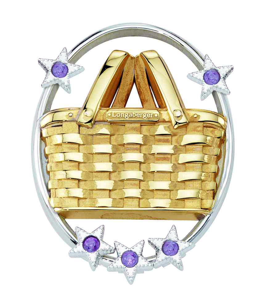 The iconic Longaberger basket sits center stage on this custom two tone add-on brooch pin. Stone set stars can be added on-the-spot for a variety of achievements.