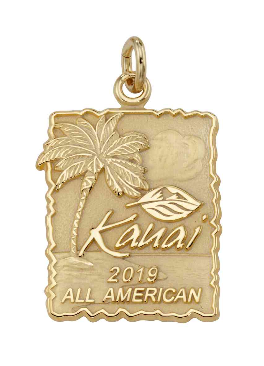 This custom 10 karat gold charm commemorates a trip to Hawaii for an All American competition.  The organization's logo is thoughtfully designed into the leaf floating on the warm breeze.