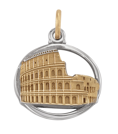 A modeled Roman colosseum stands out at the center of this gorgeous custom two-tone trip charm. Trip details and dates are included on the back.