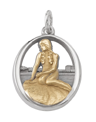 The iconic Little Mermaid status in Copenhagen Denmark is modeled in this elegant custom two-tone trip charm. Event details and dates are engraved on the back.