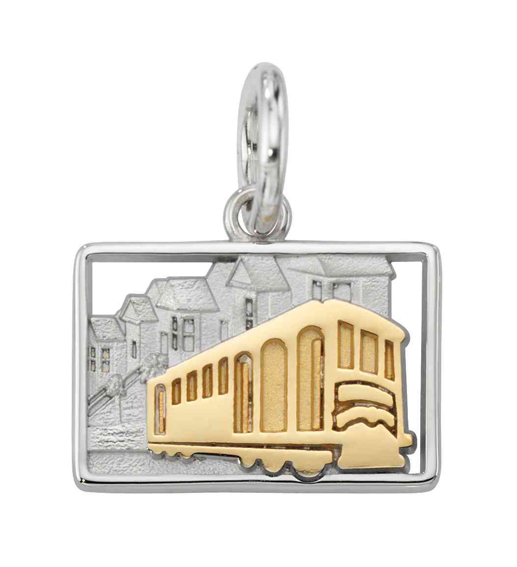 The classic San Francisco streetcar pops out in gold on this one-fo-a-kind custom two-tone trip charm. Event details and dates are engraved on the back.