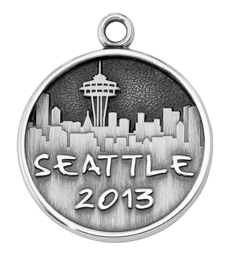 The Seattle skyline adorns this custom silver sandblast and polished antiqued trip charm. With trip details and dates on the back, it is a truly one-of-a-kind keepsake.