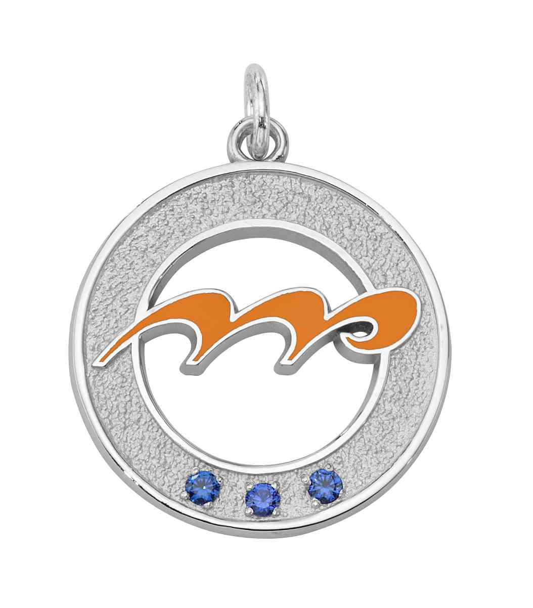 The orange color-fill brings out the wave logo on this custom sterling silver sandblast and polished charm. Used for length of service recognition, the number of color of the stones represent years of service.