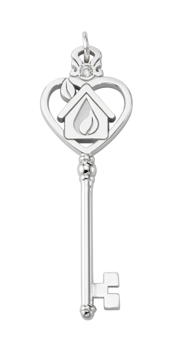 The company logo is nestled in the middle of this timeless custom high polished silver key pendant charm. Great for a promotional sales incentive.