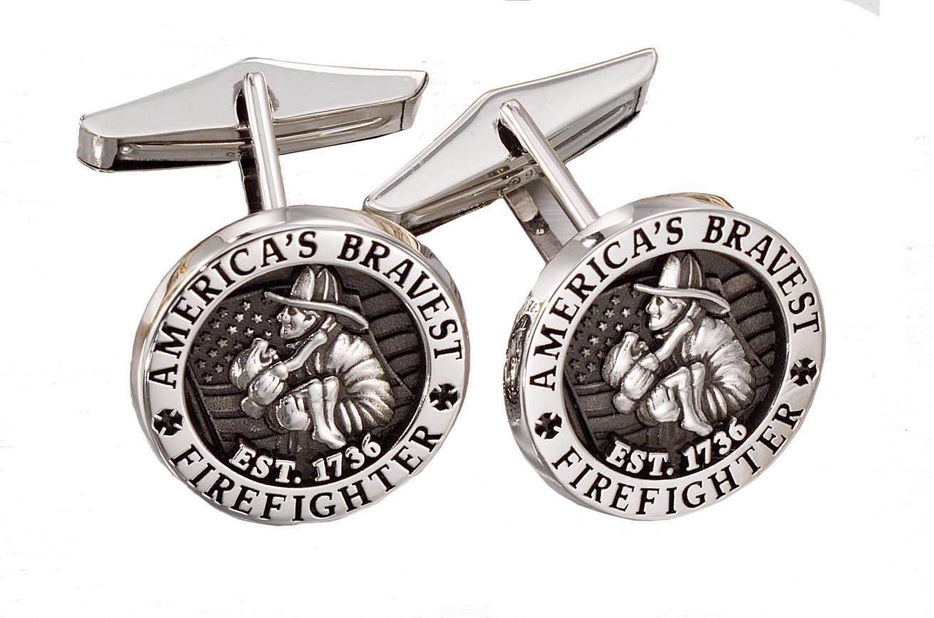 A modeled fireman and child mark the center of these custom silver antique finished cufflinks. Recognizing America's Bravest Firefighter, they evoke a timeless feel in a noble way.