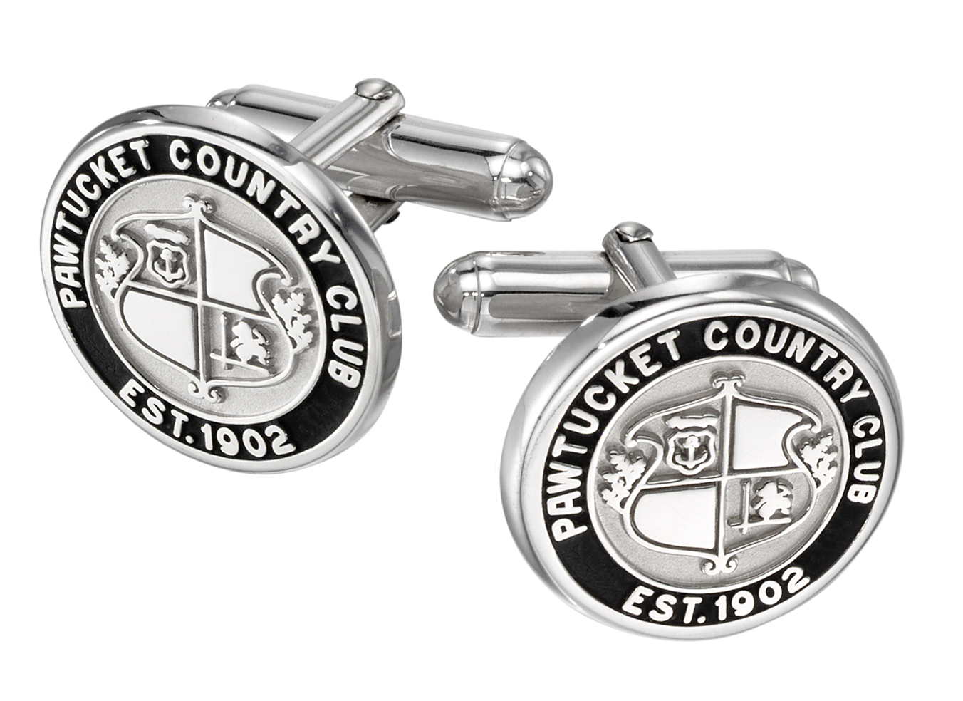 The shield-like crest of the Pawtucket Country Club is depicted on these custom sterling silver high polished cufflinks. Available for purchase by club members and guests in the pro shop.