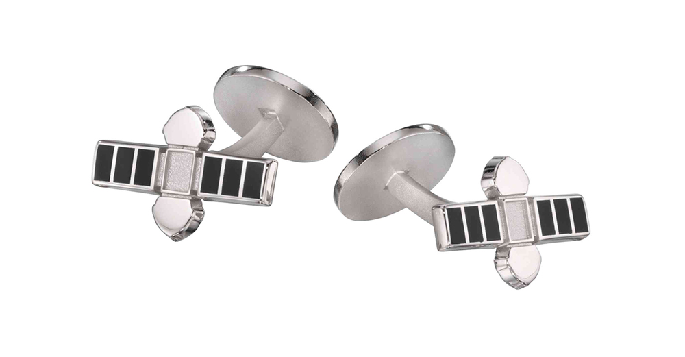 These custom modeled satellite cufflinks make you feel like you are in space yourself. Made in sterling silver with a sandlast and polished finish and black laquer color-fill.
