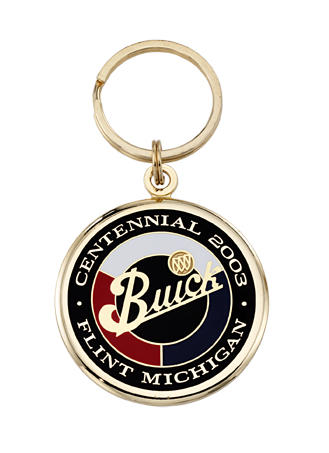 The Buick logo stands out in gold on a three color background on this custom high polished gold keytag celebrating Buick's Centennial Anniversary in Flint Michigan.