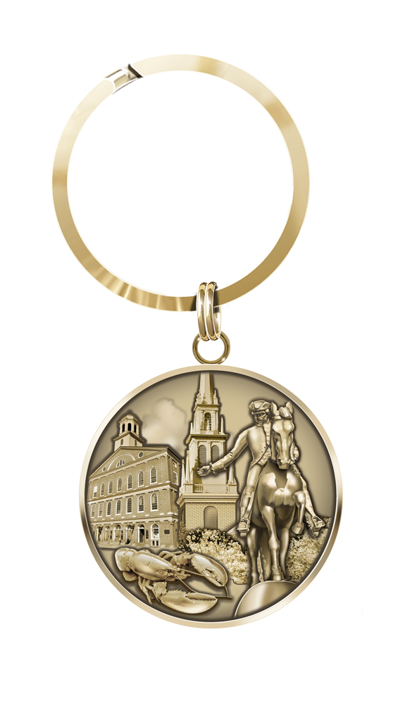 The iconic landmarks of Boston are modeled into this custom gold antiqued keytag. Event details and dates are engraved on the back of this one-of-a-kind keepsake.