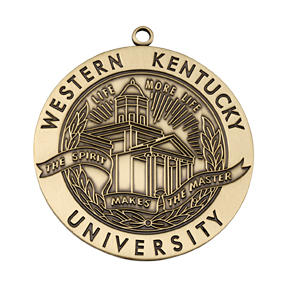 This Western Kentucky University medallion has an brushed gold antiqued finish and is ready for a ribbon attachment. Different colored ribbons can signify different levels of achievement.