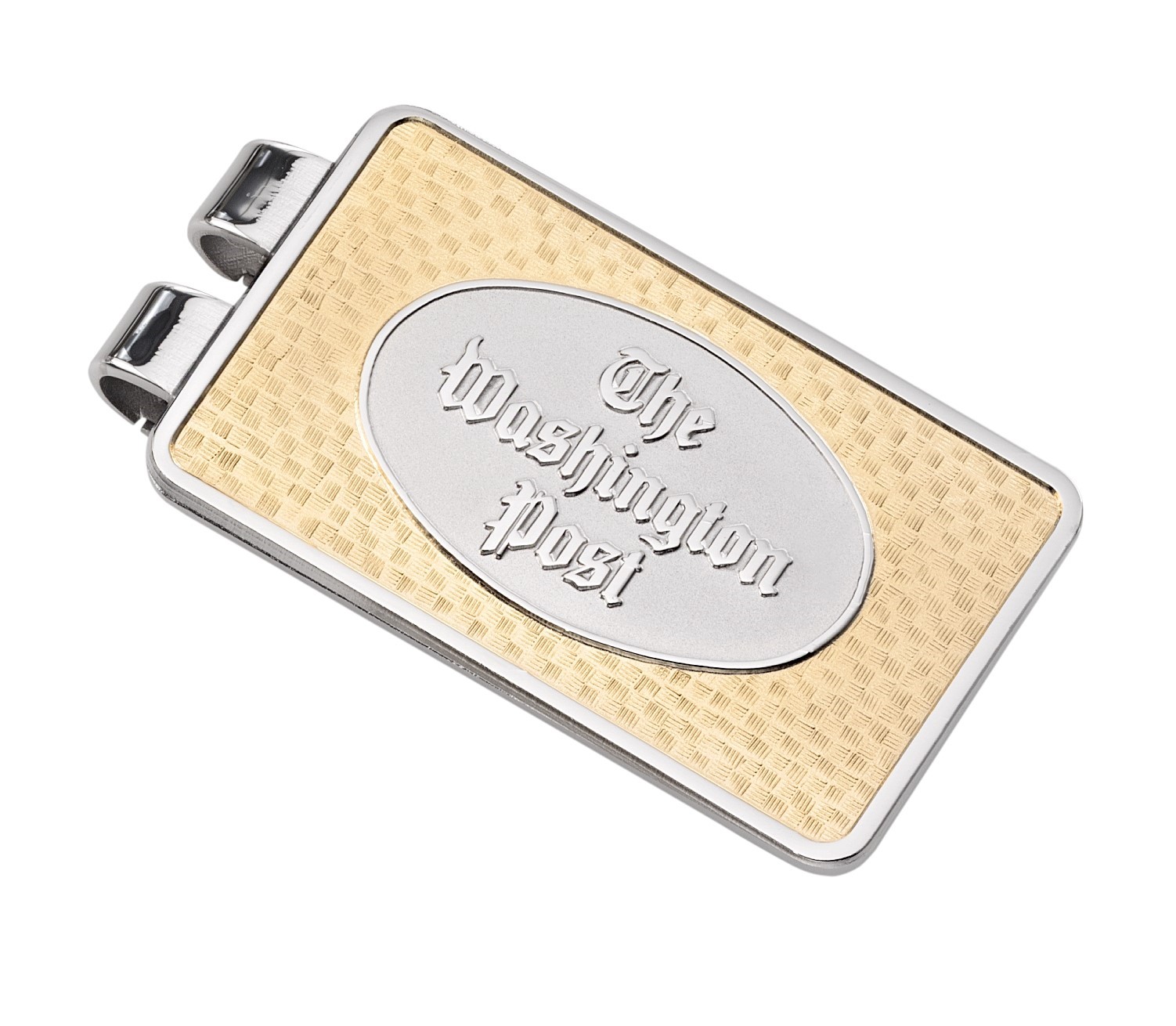 A silver logoed insert and patterned gold background come together to give this custom money clip an sophisticated look and feel. A great award option for employee years of service or as customer gifts.