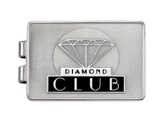 A brushed silver finish with black color-fill highlights the Diamond Club logo on this custom silver money clip. This piece was given out as gifts for frequent customers.