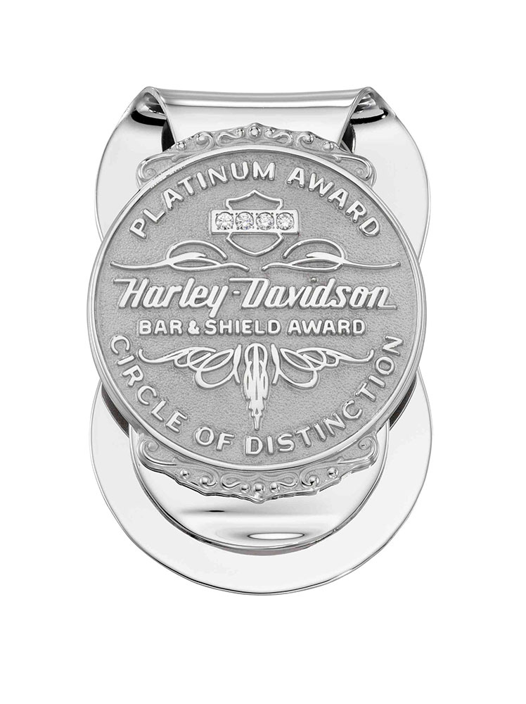 This elegant custom sandblast and polished silver peanut style money clip has embedded diamonds and honors those with top sales for the year at Harley-Davidson.