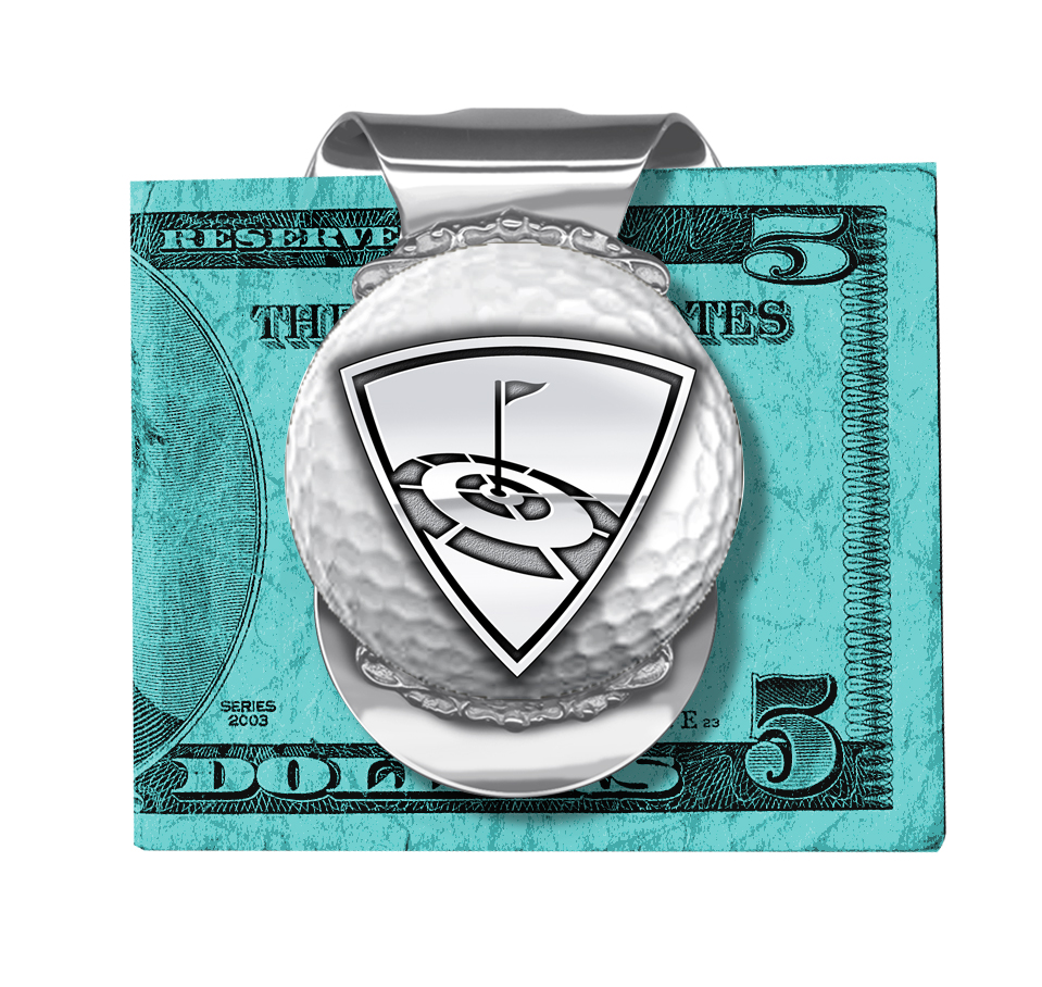 The Top Golf logo sites proudly atop a modeled golf ball image on this custom peanut style silver money clip. A great gift for tournament players and sponsors.