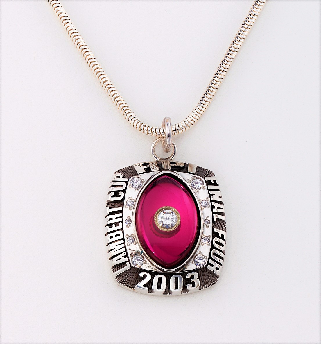 Mirroring the top of the championship ring bezel, this beautiful necklace pendant honors RPI football players for making the final four.