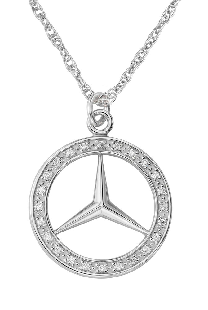 Diamonds encircle the pierced Mercedes logo in this elegant custom sterling silver necklace pendant. A great gift for a new car buyer or top sales achiever.