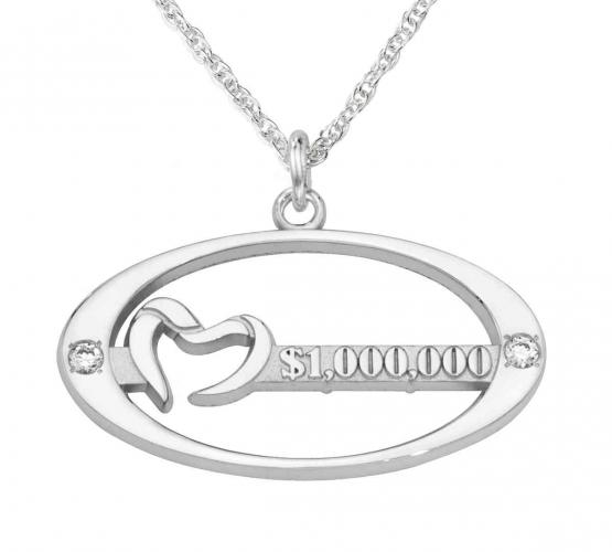 The Pure Romance heart logo sits next to the sales award level on this custom high polished silver necklace pendant with two stone set diamonds. A modern and elegant sales award piece.