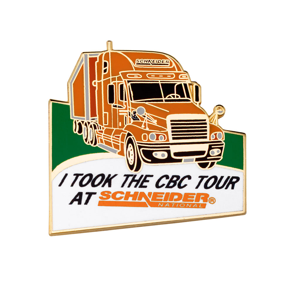 Schneider Trucking gave out these pins to those who completed their CBC tour. Their signature orange truck and logo certainly catch the eye and make for a fun custom piece.