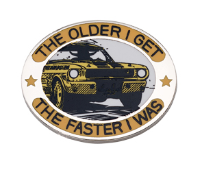 This custom brand awareness pin features a detailed vintage Mustang and charming slogan. It was used to promote and commemorate.