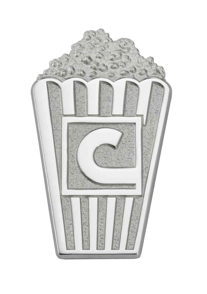 The Cinemark logo is featured on this unique and charming sterling silver plated popcorn box pin. This pin was designed and produced in a series of length-of-service awards for the company.
