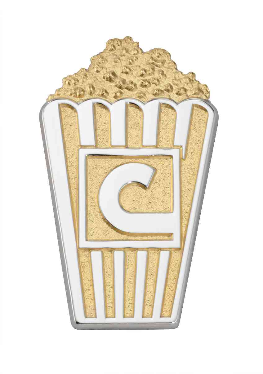 This two-tone popcorn box pin sports the Cinemark logo. This design indicates one of the comapny's length-of-service levels. This custom popcorn box pin was designed and produced in a series of length-of-service awards for the company.pin