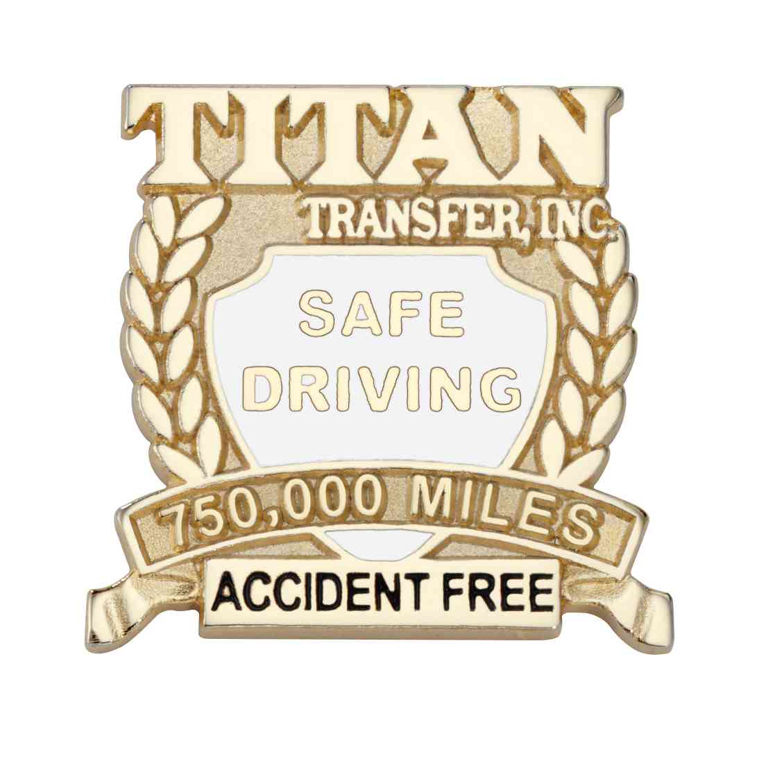 This gold plated safe driving pin celebrates 750,000 miles driven without an accident. It is the third award in a safe driver series for Titan Trunking, Inc. The logo sits on top of a sheild flanked by laurels, and a banner below declares the number of miles driven accident free.pin