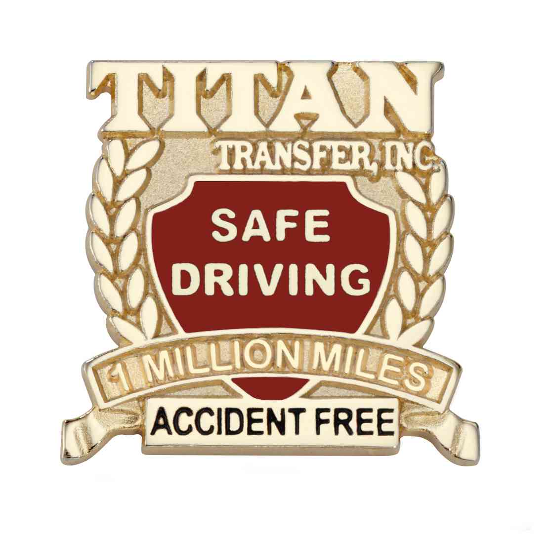 This gold plated safe driving pin celebrates 1 million miles driven without an accident. It is the highest award in a safe driver series for Titan Trunking, Inc. The logo sits on top of a sheild flanked by laurels, and a banner below declares the number of miles driven accident free. Color-fill is used to add the company's colors to the sheild.