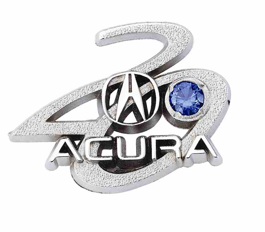 A swooping "20" intertwines with the Acura logo to celebrate this company's 20th anniversary. A round sapphire stone adds some dazzle and company color.