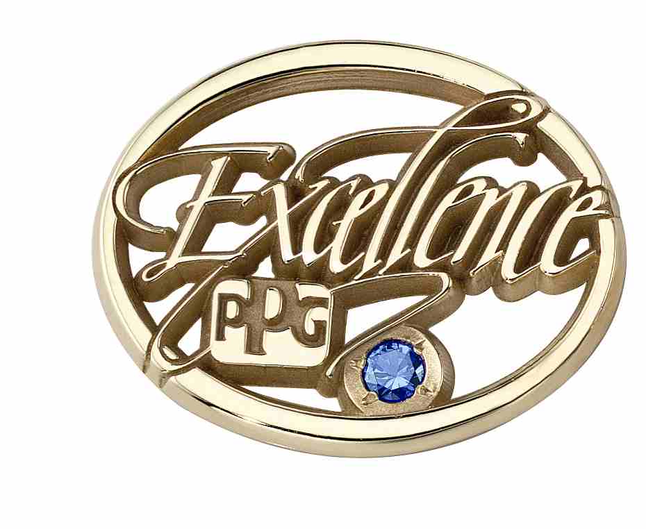 Excellence is at the forefront of this company's pin. A symbolic sapphire stone representing the recipient's length of service is placed next to the company logo.