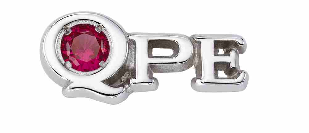 The "Q" in this company's initials is filled with a symbolic ruby on this pin.