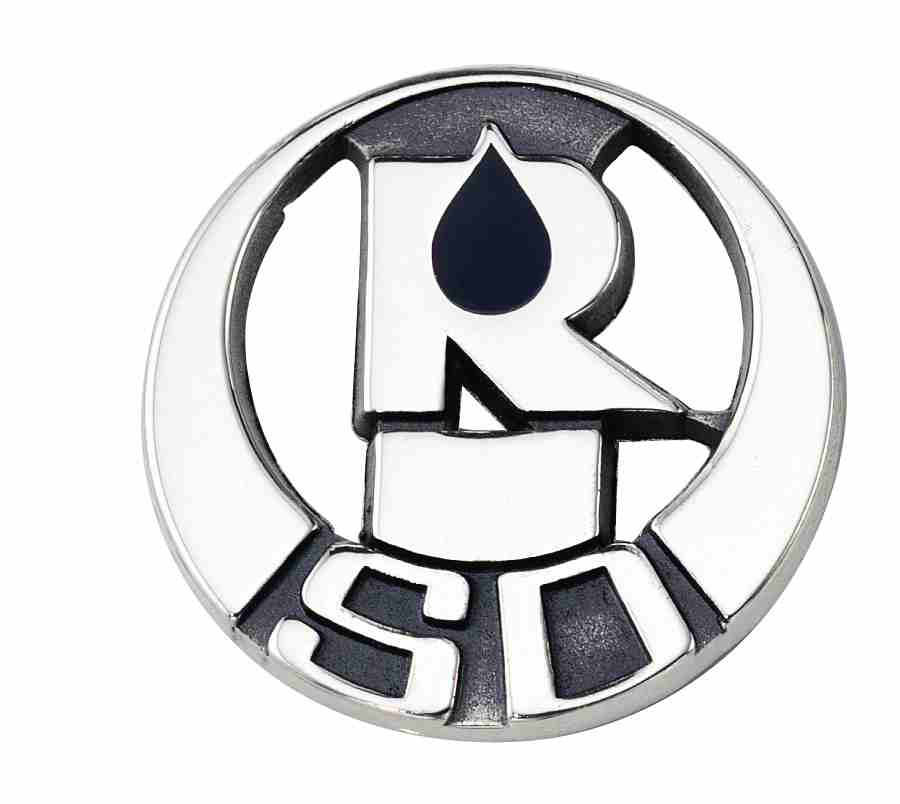 This pin features the company's logo inside a circle. The drop shape has been colored navy blue, and the letters "SD" are positioned directly below.