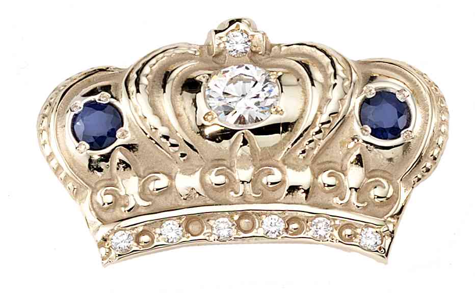 This beautifully detailed crown is given all the proper embellishments. Diamonds and sapphires add color and sparkle to this pin.