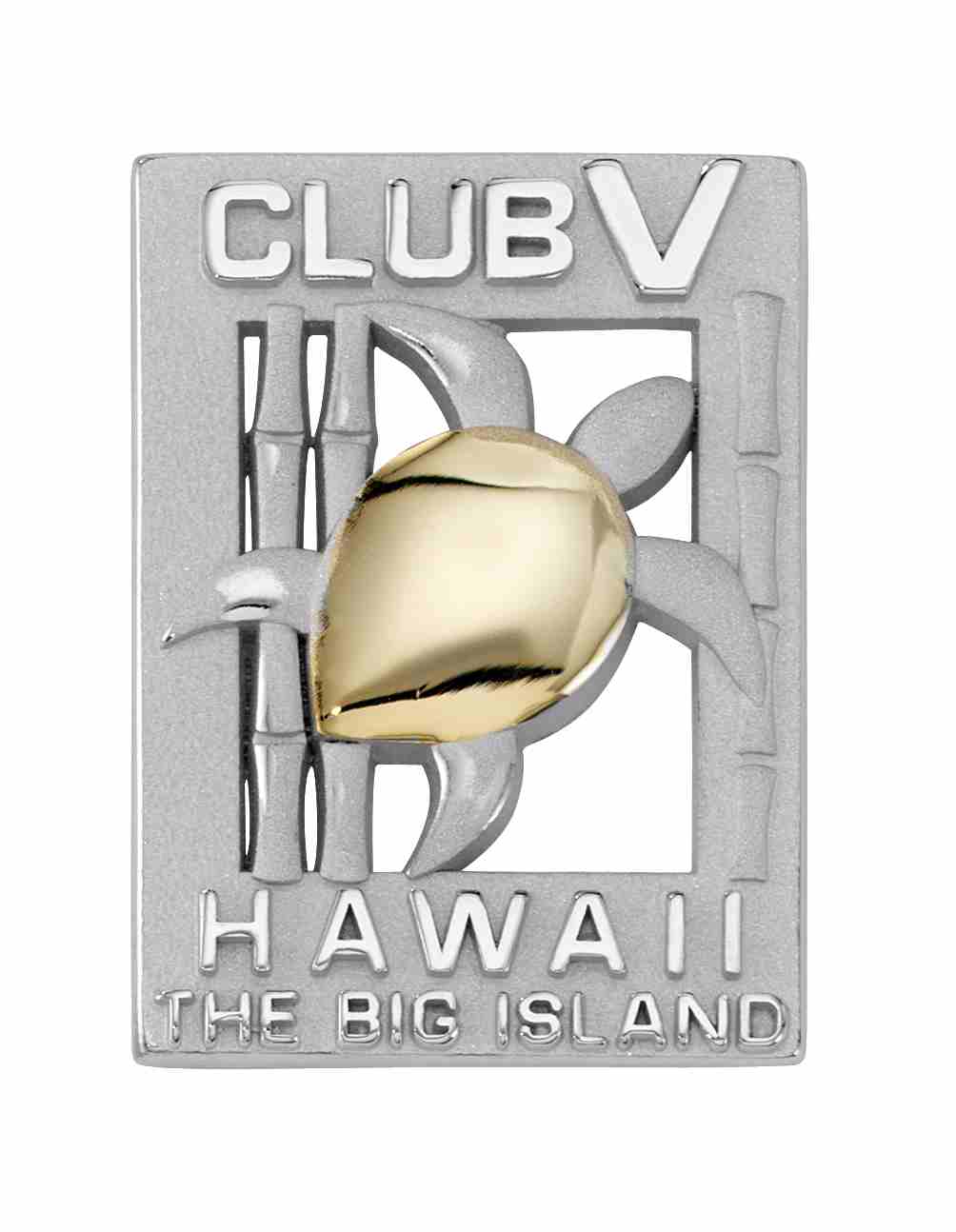 A golden-shelled sea turtle float across a bamboo frame on this trip commemorative pin.
