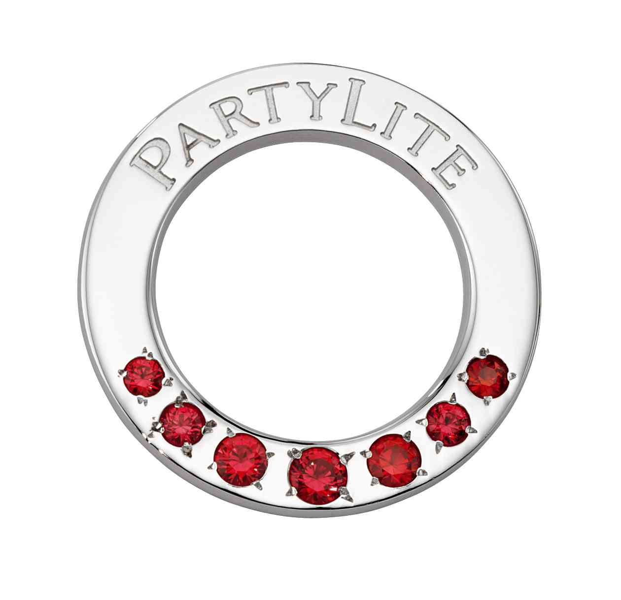 This simplistic and elegant pin holds a large ruby in the center, with progressively smaller rubies on either side. The company name is engraved at the top.