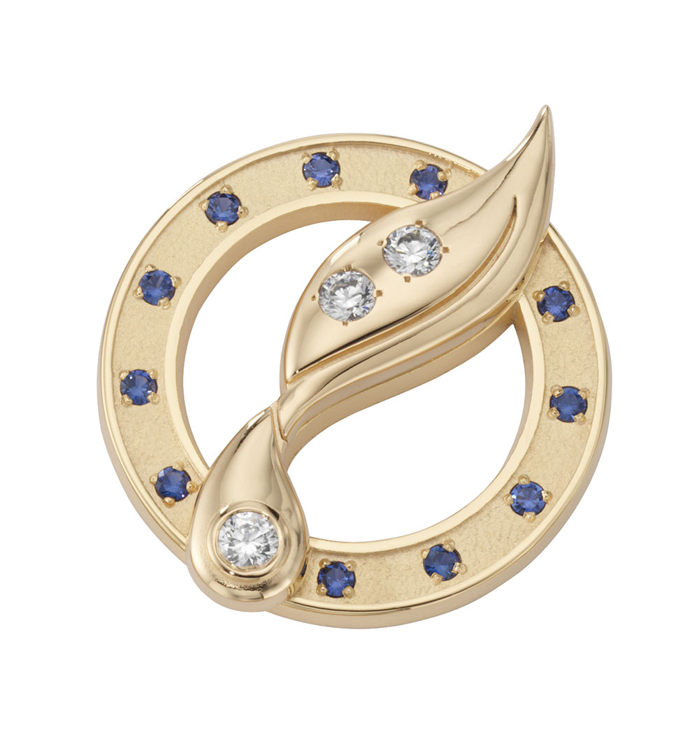 A swirling paintbrush logo extends beyond a circular frame of sapphires. Diamonds add even more sparkle.