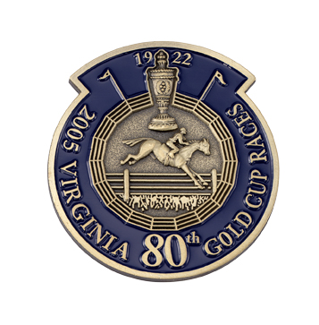 This unique custom antique gold with blue color-fill lapel pin commemorates not only the Virginia Gold Cup but that it marked the 80th anniversary for these prestigious horse races.