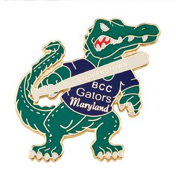 Featuring the BCC Maryland Gator, this custom gold and color-filled BCC baseball trading pin makes for a truly special keepsake of a once-in-a-lifetime event.