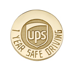 The UPS logo sits center stage in this elegant gold sandblast and polished years of safe driving award lapel pin.